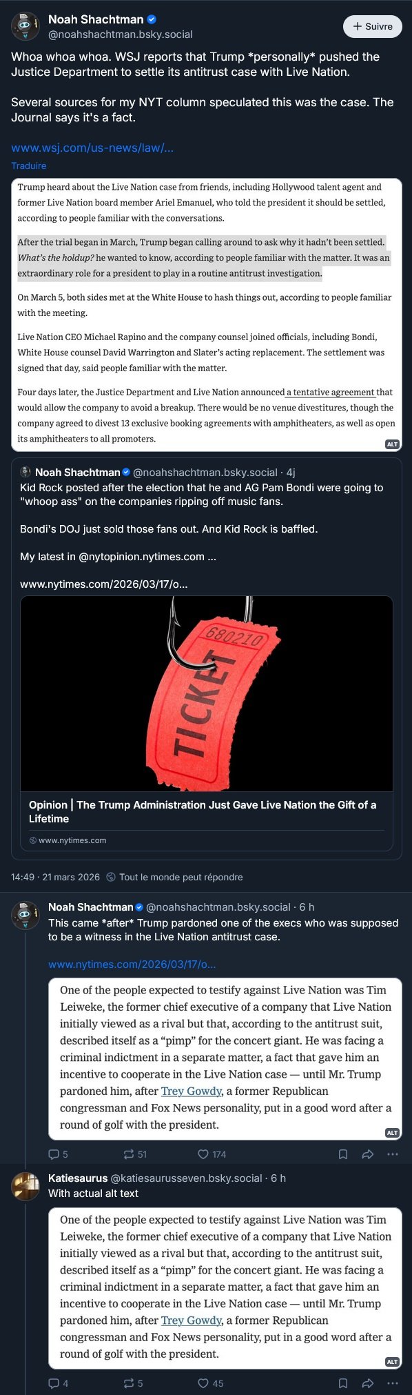 Qui est vraiment surpris d’apprendre que Donald est intervenu personnellement pour le Département de la Justice règle hors-cour la poursuite antitrust contre l’organisateur de concerts Live-Nation (avec ses prix dynamiques, ses frais cachés et son monopole sur les grosses salles de concerts aux États-Unis). Une petite pensée (moqueuse) aux artistes qui l’ont soutenu :