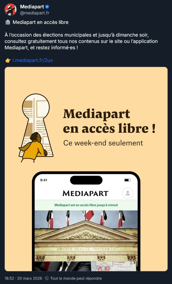 Mediapart est à nouveau consultable gratuitement tout le week-end, pour les élections municipales :