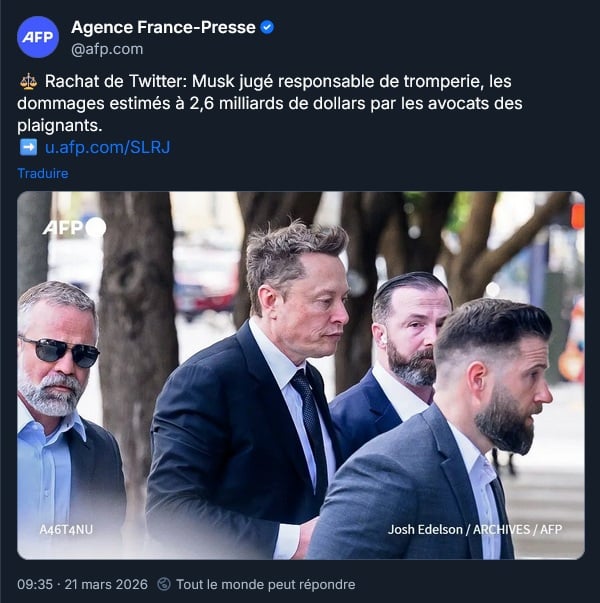 Elon est jugé coupable de tromperie de ses investisseurs avec deux tweets qui ont fait baisser l’action de Twitter avant son rachat. Les avocats des plaignants estiment les dommages à 2.6 milliards de dollars :