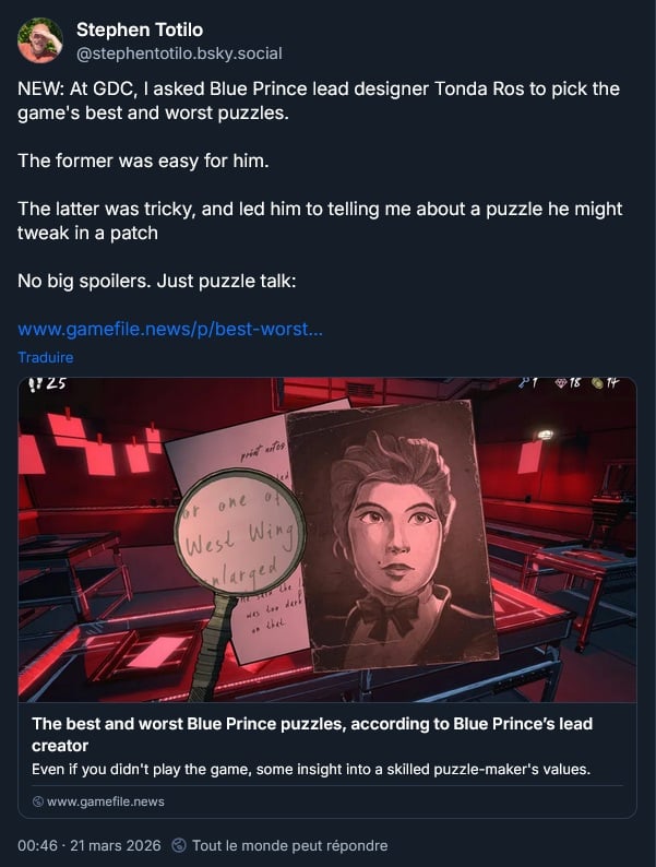 Tonda Ros parle puzzles de Blue Prince avec Stephen Totillo :