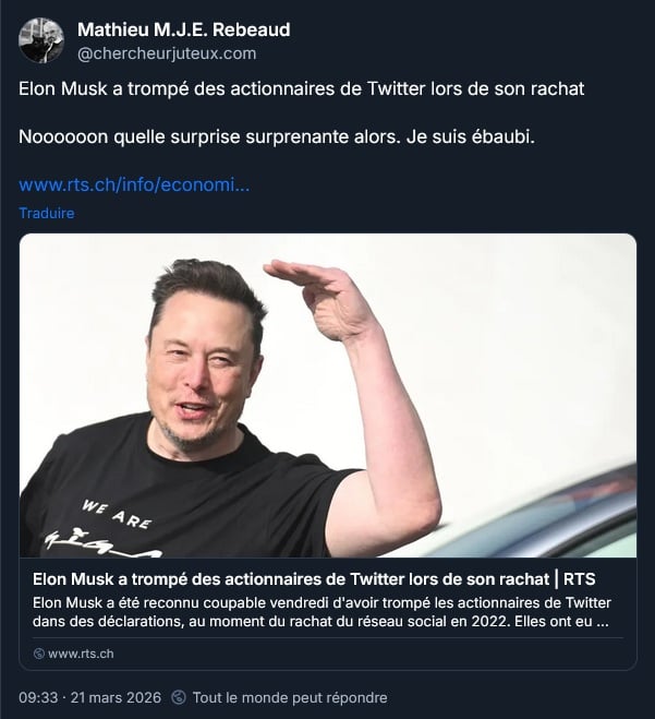Aujourd’hui, à propos de Twitter ou des autres compagnies d’Elon Musk :