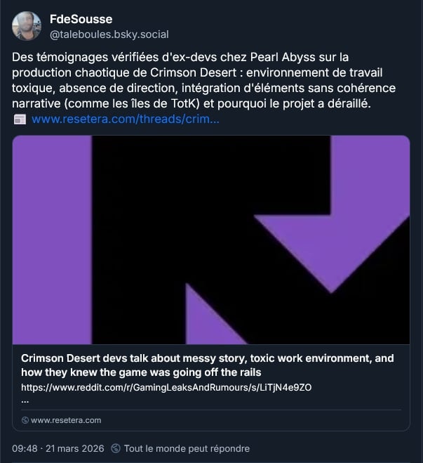 D’anciens développeurs de Crimson Desert témoignent du développement chaotique et toxique du jeu :
