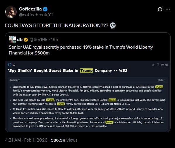 Les Émirats Arabes Unis ont acheté 49% de l’entreprise de cryptomerdouilles Trump 4 jours avant l’entrée en fonction du mec orange :
