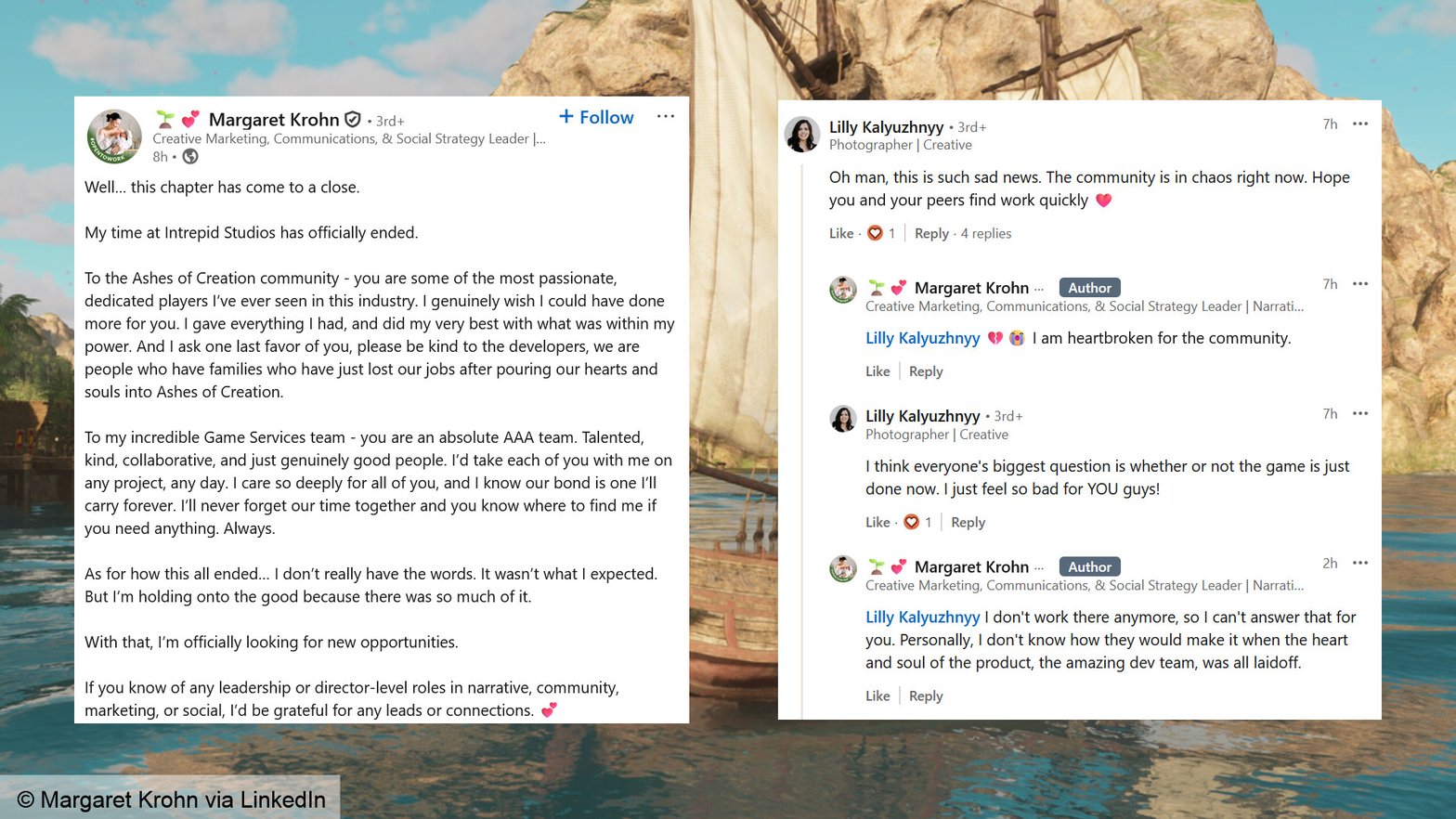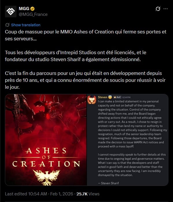 Intrepid Studios (Ashes Of Creation) a licencié un nombre non-précisé de personnes, et le directeur Steven Sharif a démissionné :