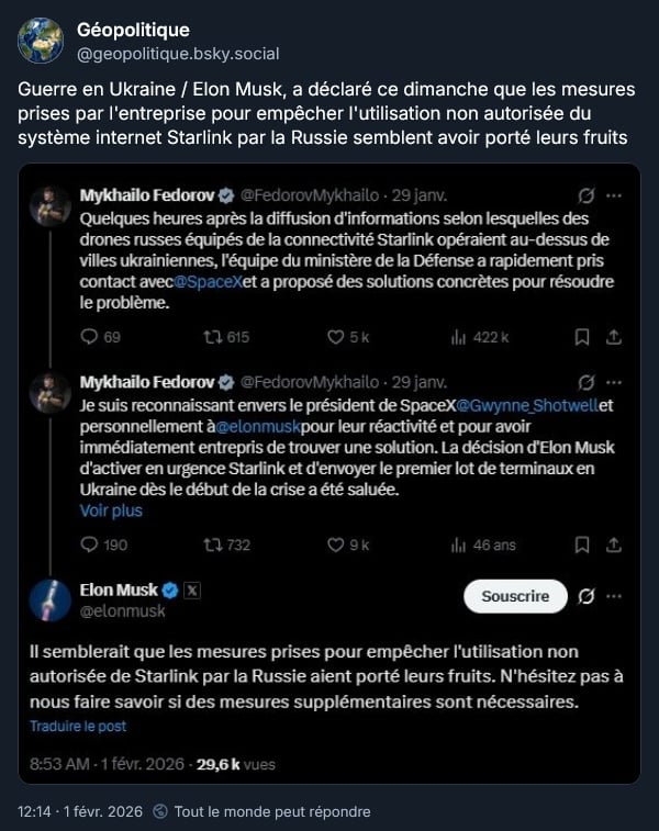 Malgré sa réponse initialement douteuse au Ministre des Affaires Étrangères polonais, SpaceX a pris des mesures pour empêcher les drones russes d’utiliser les terminaux Starlink qui semblent bien fonctionner. Oui, des fois, ils font des trucs bien et il faut le mentionner :