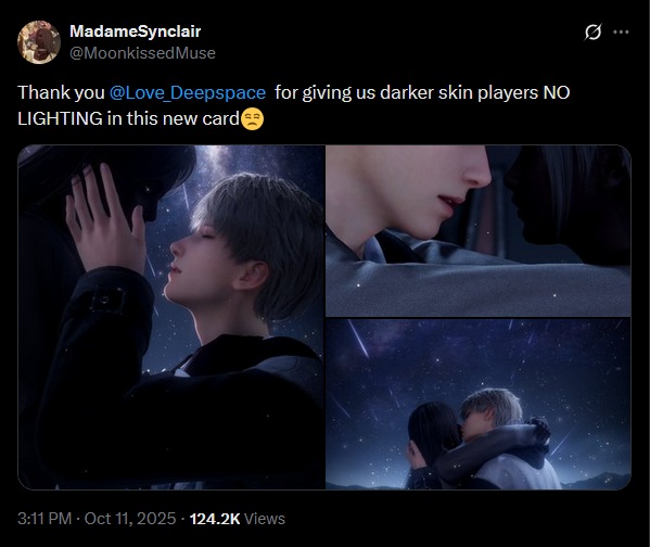L’Otome free-to-play Love and Deepspace a des problèmes pour afficher les personnages customisées avec une peau sombre. Le problème devrait être réglé dans la prochaine mise à jour :