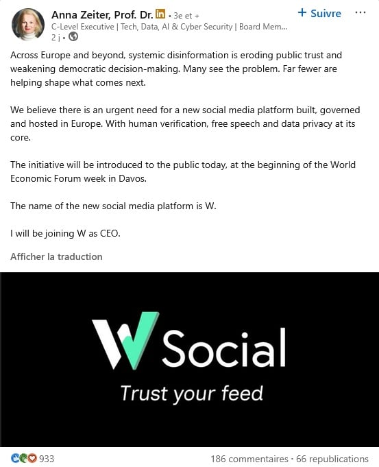 Anna Zeiter, ancienne Chief Privacy Officer d’eBay, lance le réseau social W, qui se définit comme l’anti-Twitter. Avec vérification obligatoire d’identité avant de poster :