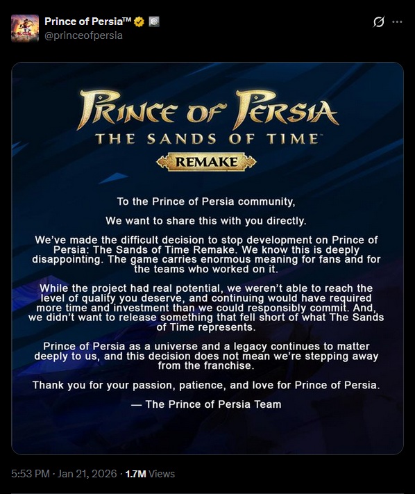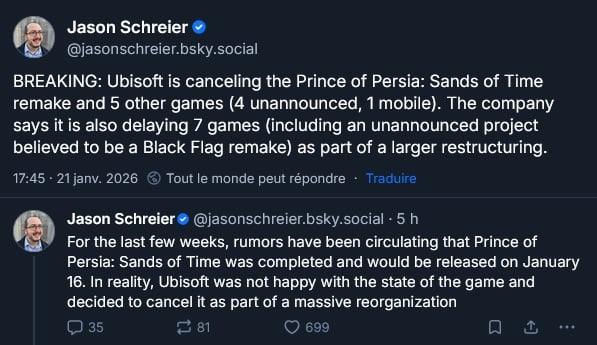 Ubisoft annule 6 jeux dont le Remake de Prince Of Persia : Sands Of Time et retarde 7 jeux dont probablement le Remake de Black Flag :