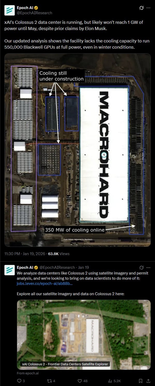 Elon a parlé de 1 gigawatt de capacité pour son data-center Colossus 2. Selon des photos satellites, ce serait plutôt 350 megawatts :