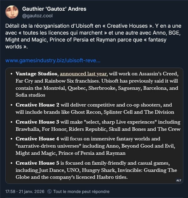 Voilà la réorganisation d’Ubisoft en « Creative Houses » :