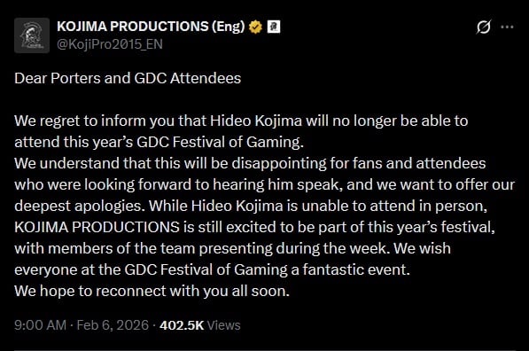 Hideo Kojima n’ira pas kojimer à la GDC 2026 :