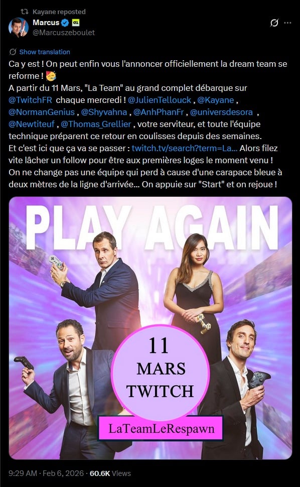 La TeamG1 de feu GameOne revient sous la forme de LaTeamRespawn sur Twitch le 11 Mars :
