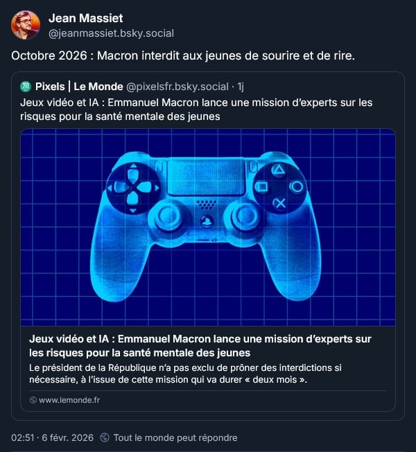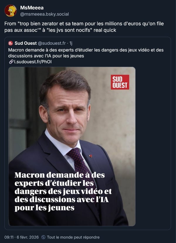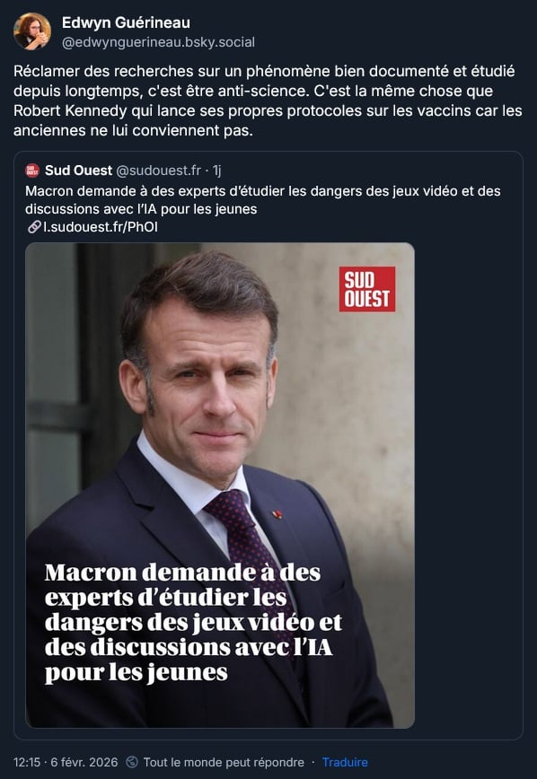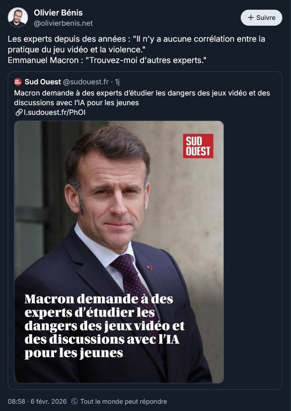 Emmanuel Macron lance une étude sur les dangers des jeux vidéo (bordel) et des agents IA pour les enfants et les ados :