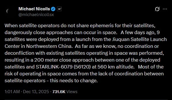 Un satellite chinois a failli entrer en collision avec un satellite Starlink. Starlink est pas content :