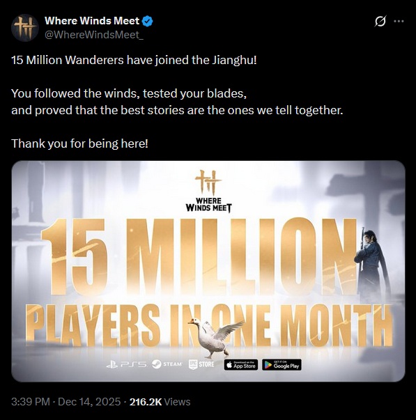 15 millions de joueurs pour le free-to-play Where Winds Meet :