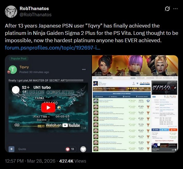 Un joueur japonais a atteint pour la première fois le trophée platine pour Ninja Gaiden Sigma 2 Plus sur PlayStation Vita, 13 ans après sa sortie :