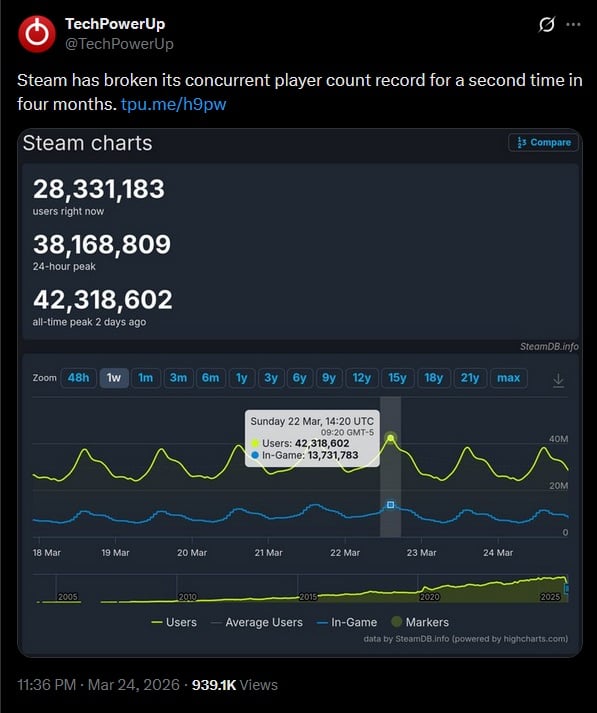 Steam a encore battu son record de fréquentation la semaine dernière :