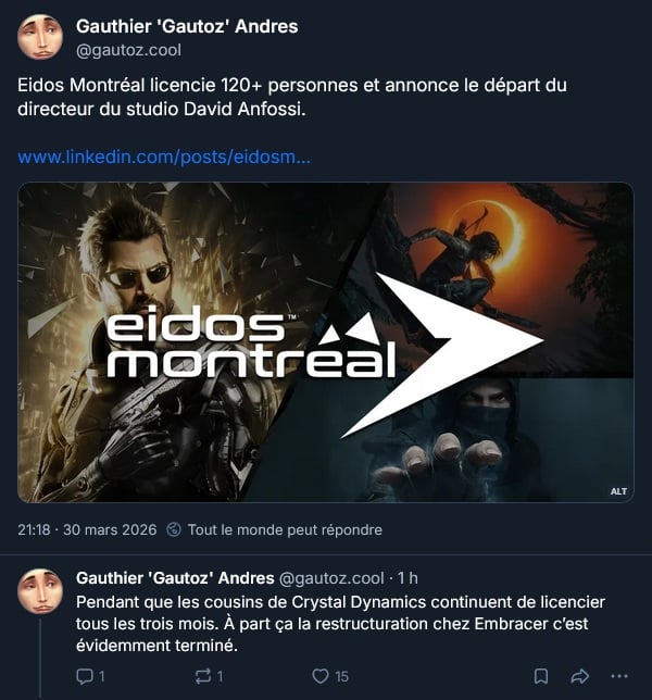 Eidos Montréal licencie 124 personnes. Licenciements en série qui n'ont évidemment absolument rien à voir avec la baisse des crédits d'impôts au Québec pour les entreprises du jeu vidéo depuis 2024 :