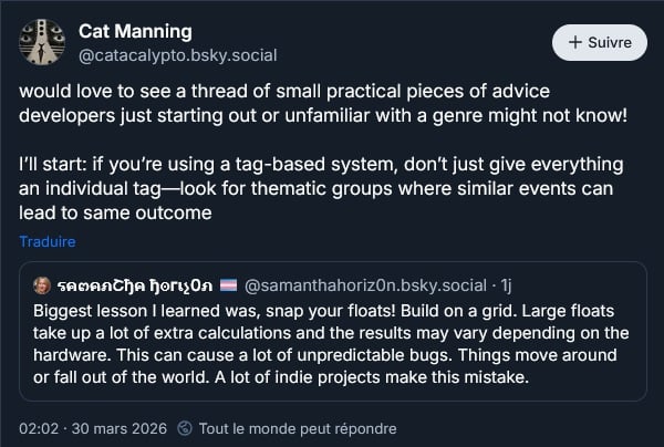 Cat Manning a commencé un fil Bluesky sur les conseils aux jeunes développeurs pour un jeu d’un genre avec lequel ils ne sont pas familiers :