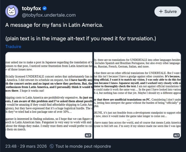 Si Undertale n’a qu’une traduction japonaise officielle, c’est parce que Toby Fox connait le Japonais et veut absolument que la traduction « garde sa vision ». Mais il est toutefois bien content que des traductions non-officielles existent :