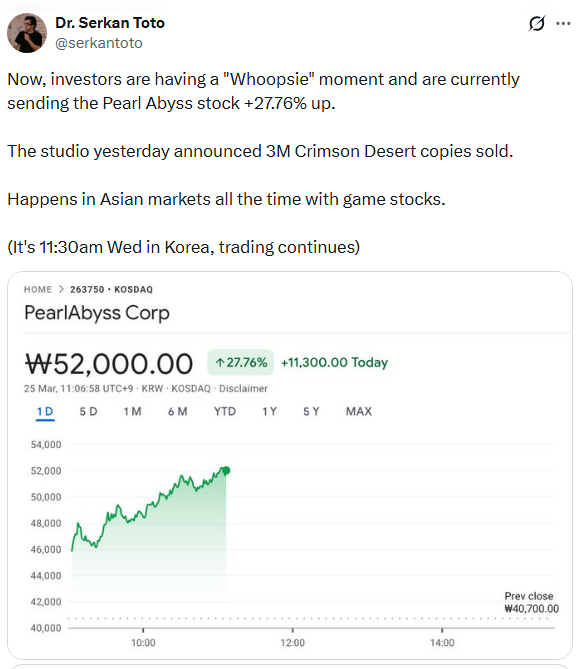 Suite à l’annonce des 3 millions de vente de Crimson Desert, l’action de Pearl Abyss a remonté. Après avoir salement baissé après la note Metacritic :
