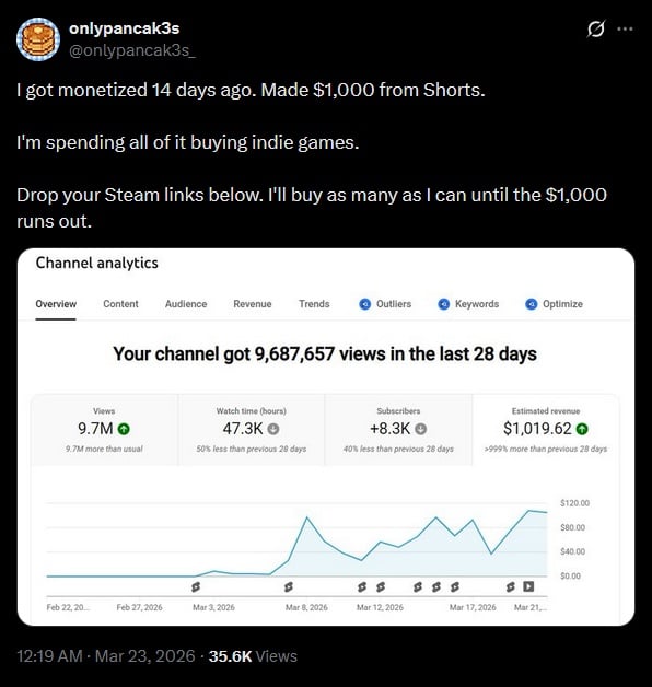 Un développeur indé a ramassé 1000$ en monétisant sa chaine YouTube montrant ses progrès sur son jeu de course sans fin Sensory Overload qui sort un jour prochain sur Steam. Il a aussi ramassé 14.000 wishlists en 4 jours. Du coup, il prend les liens Steam sur son compte Twitter pour acheter des jeux indés les uns après les autres avec l’argent récolté :