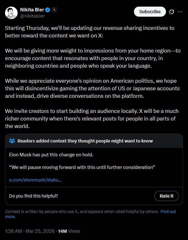 Nikita Bier, Head Of Product sur Twitter a annoncé que les créateurs seraient moins payés s’ils ne parlaient pas de l’endroit où ils vivaient à partir de demain. Genre pour éviter les comptes MAGA vivant en Thailande. Elon a annoncé que non, en fait, ce sera pour plus tard :