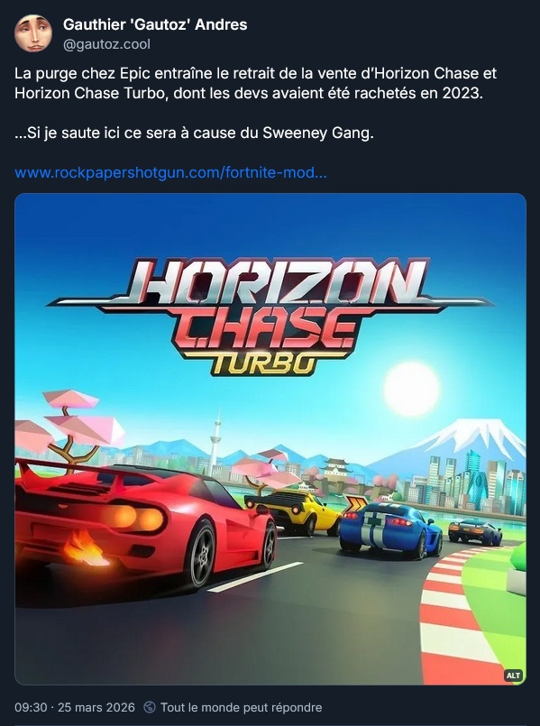 Horizon Chase et Horizon Chase Turbo vont être retirés de la vente suite aux 1000 licenciements chez Epic Games :