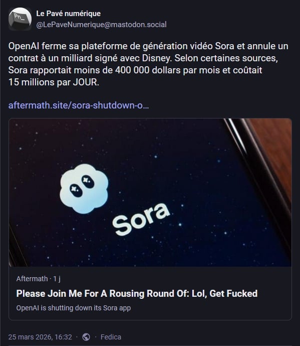 A propos de la fermeture de Sora, il semble que le machin rapportait 400.000$ par jour par mois. Et coutait 15 millions de dollars par jour :