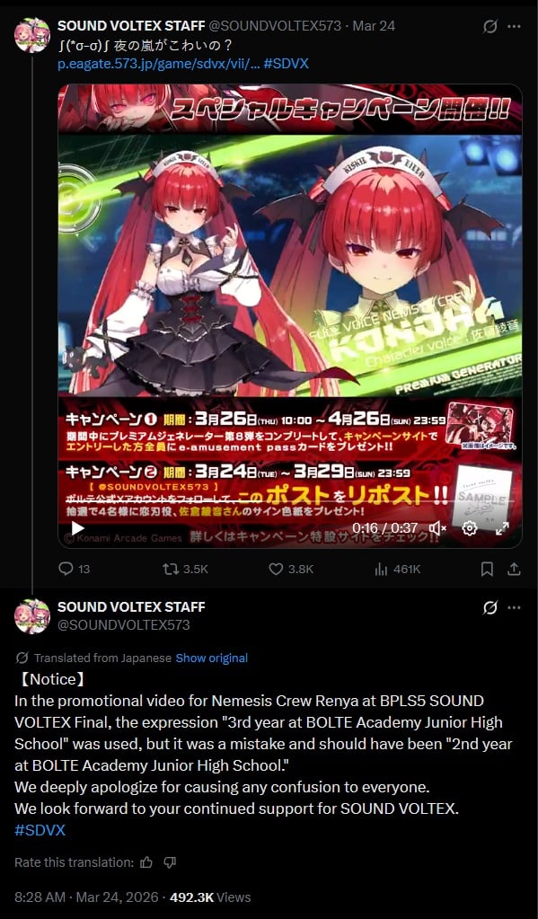Konami s’excuse d’avoir fait une erreur dans un clip promotionnel qui a vieilli d’un an Konoha, élève de la Volte Academy Middle School dans le jeu d’arcade SOUND VOLTEX ∇. Si je ne me trompe pas dans l’équivalence des systèmes éducatifs, elle doit avoir entre 13 et 14 ans. Oui, Japon, tout ça, mais quand même :