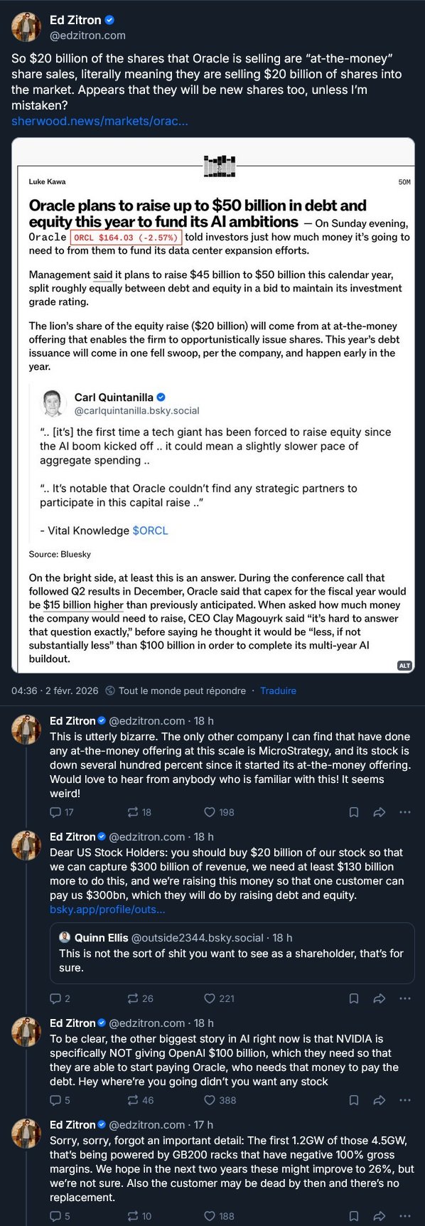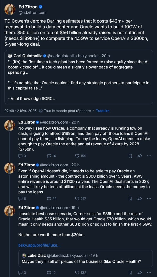 L’action d’Oracle a baissé quand l’entreprise a annoncé son ambition d’encore lever 45 à 50 milliards de dollars de dettes pour construire des datacenters :