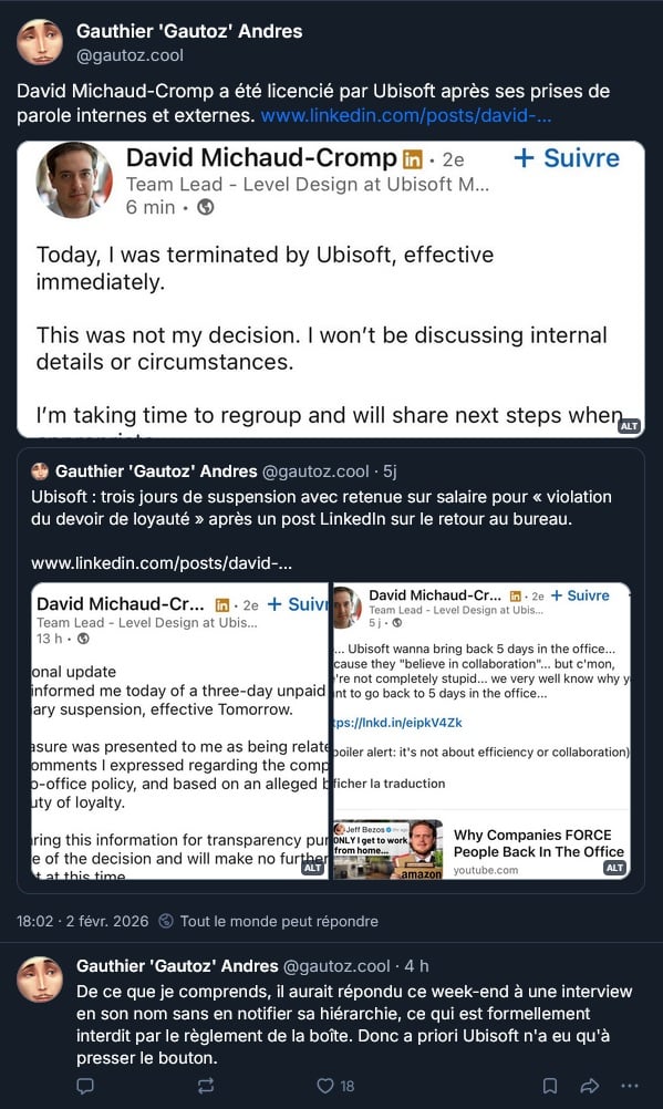 David Michaud-Cromp, qui avait été suspendu pour avoir critiqué le retour obligatoire au bureau d’Ubisoft poliment sur son LinkedIn et plus énergétiquement sur la messagerie interne de l’entreprise, a été finalement licencié :