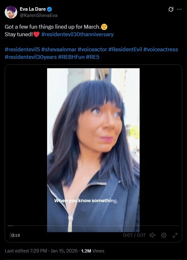 Eva La Dare, qui joue Sheva Alomar dans Resident Evil 5, a tweeté avoir des trucs de prévus pour Mars … :