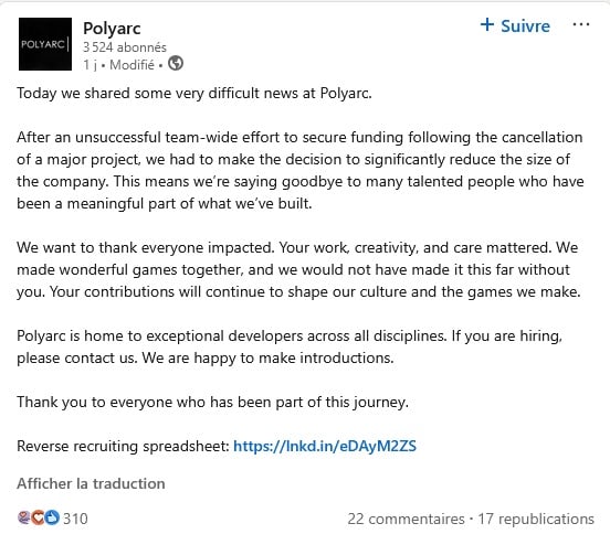 Polyarc licencie un nombre non-précisé de personnes après l’annulation d’un gros projet :