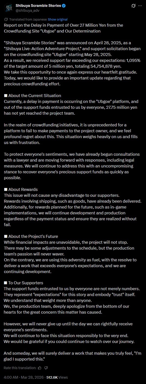 Skeleton Crew Studio, qui doit développer Shibuya Scramble Stories, étudie ses options pour poursuivre la plateforme de crowdfunding qui ne leur a pas versé 170.000$ sur les 340.000 qu’ils avaient levé via leur campagne de financement :