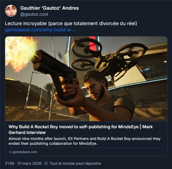 Mark Gerhard, le CEO de Build A Rocket Boy a annoncé que le studio préparait la mission contenant les preuves du sabotage organisé de MindsEye. Et que la police enquête. Et que le jeu va très bien. Et d’autres trucs … Y a quelqu’un qui a des problèmes avec sa perception de la réalité :