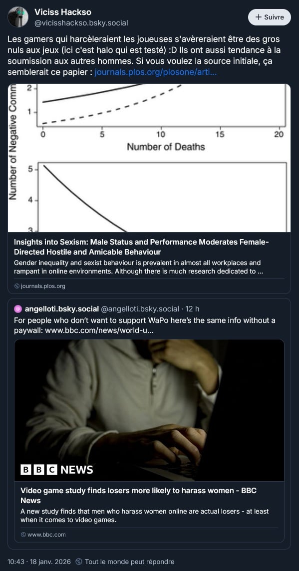Selon une étude, les joueurs qui harcèlent les joueuses … Sont bien moins bons aux jeux vidéo qu’elles … Voire même des gros nuls. En plus d’être de gros nuls de base, ils sont de gros nuls aux jeux vidéo aussi, je veux dire :