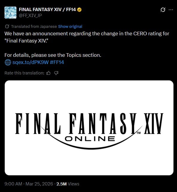 Final Fantasy XIV passera d’une classification 15+ à 17+ au Japon avec la prochaine mise à jour 7.5 :