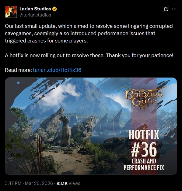 C’est le jour du hotfix pour Baldur’s Gate 3, qui corrige le problème introduit par le dernier hotfix :
