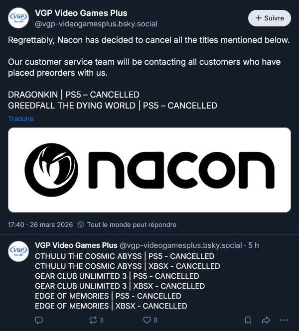 Nacon aurait annulé plusieurs sorties en physique au moins aux États-Unis :