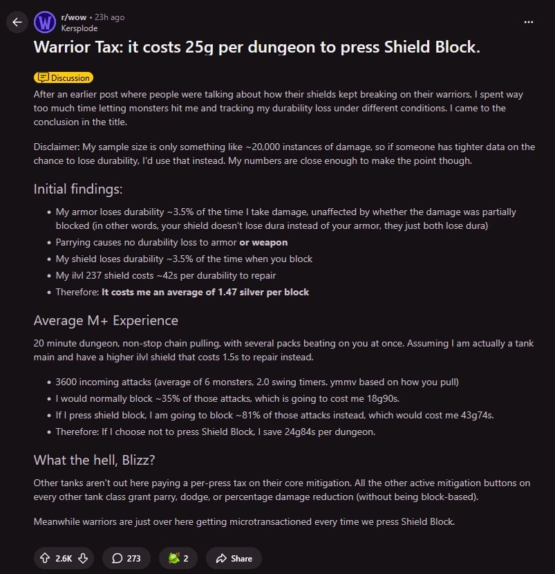 Un joueur de World Of Warcraft a montré qu’utiliser sa compétence Shield Block régulièrement lui coûtait en moyenne 25 pièces d’or de réparations en plus lors d’un raid :