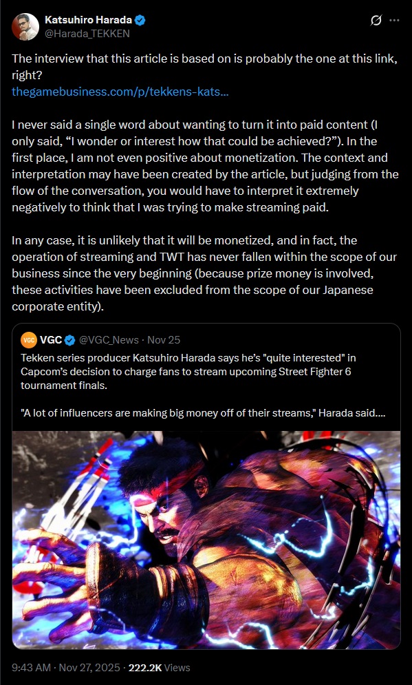 Katsuhiro Harada n’a pas dit exactement ce qu’on a dit qu’il avait dit sur les tournois de jeux de bagarre :