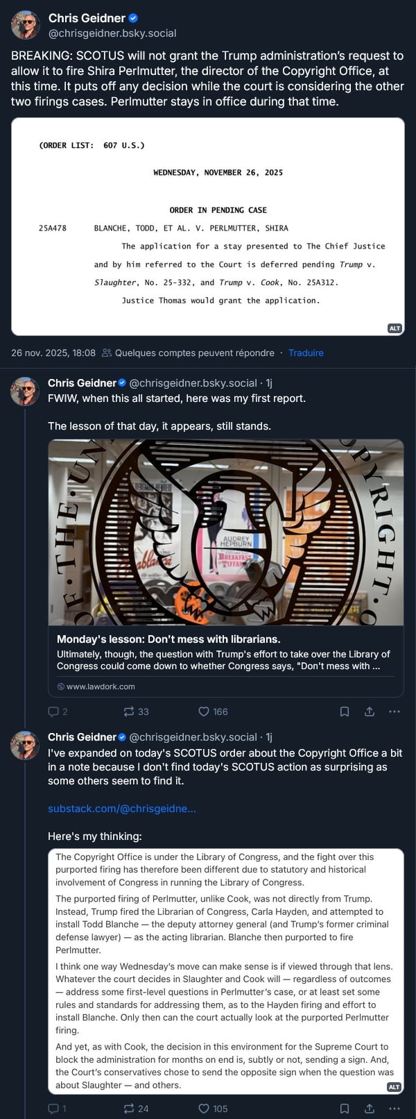 La Cour Suprême états-unienne a dit que Donald ne pouvait pas virer la directrice du bureau des copyright. Pour le moment :