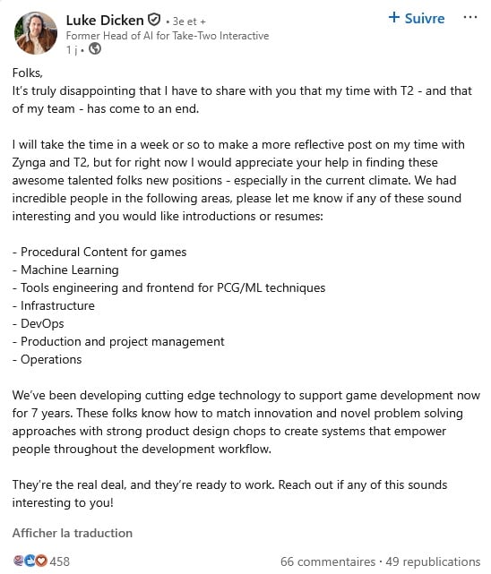 Un certain nombre de membres de l’équipe IA pas générative de Take Two ont été licenciés :