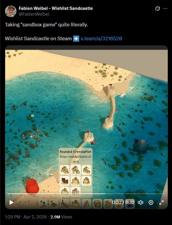 Un ptit bout de gameplay pour le jeu cozy de construction de châteaux de sable Sandcastle qui sort un jour prochain sur Steam :
