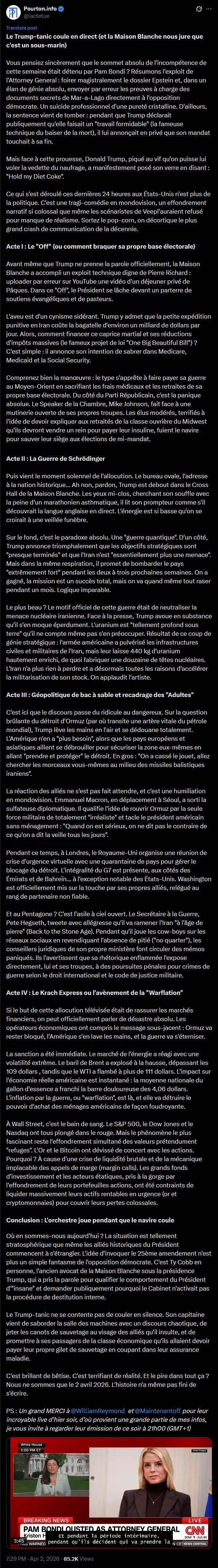 Pour faire baisser les prix des médicaments aux États-Unis, Donald a eu une idée originale. Négocier les prix au niveau de l’état au lieu de laisser chaque compagnie d’assurance négocier de son côté, comme dans tous les pays du monde Imposer une taxe douanière aléatoire de 100% sur les médicaments produits en dehors des États-Unis. Et je suis toujours pas sûr qu’il comprenne bien que ça ne rend pas les médicaments gratuits, mais que ça double le prix :