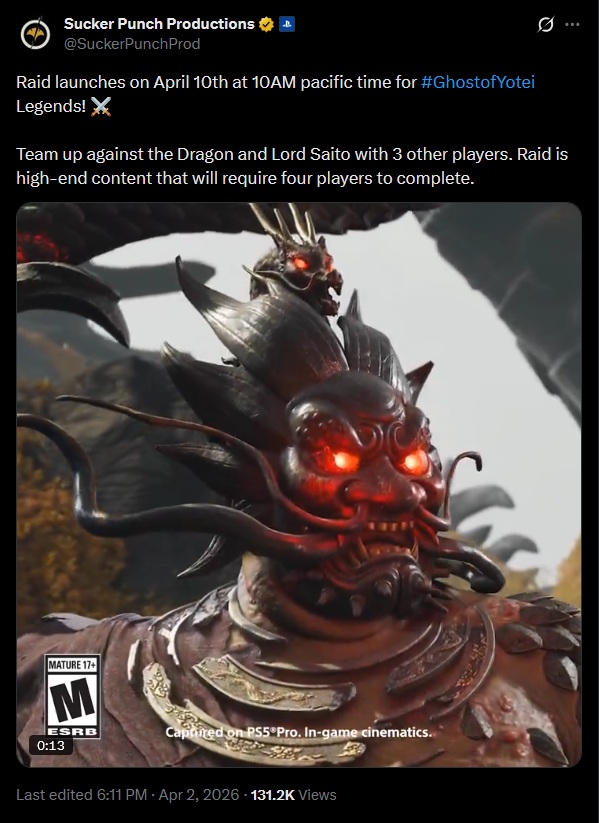 Le 10 Avril sera le jour de la mise à jour qui rajoutera le mode coop Raid Against Lord Saito à Ghost of Yōtei: Legends :
