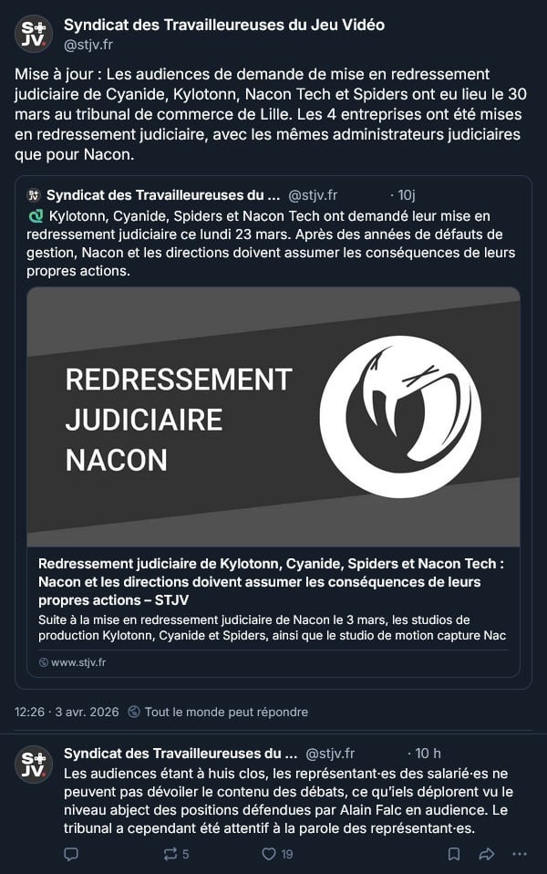 Cyanide, Kylotonn, Nacon Tech et Spiders ont été placées en redressement judiciaire, avec les mêmes administrateurs que pour Nacon :
