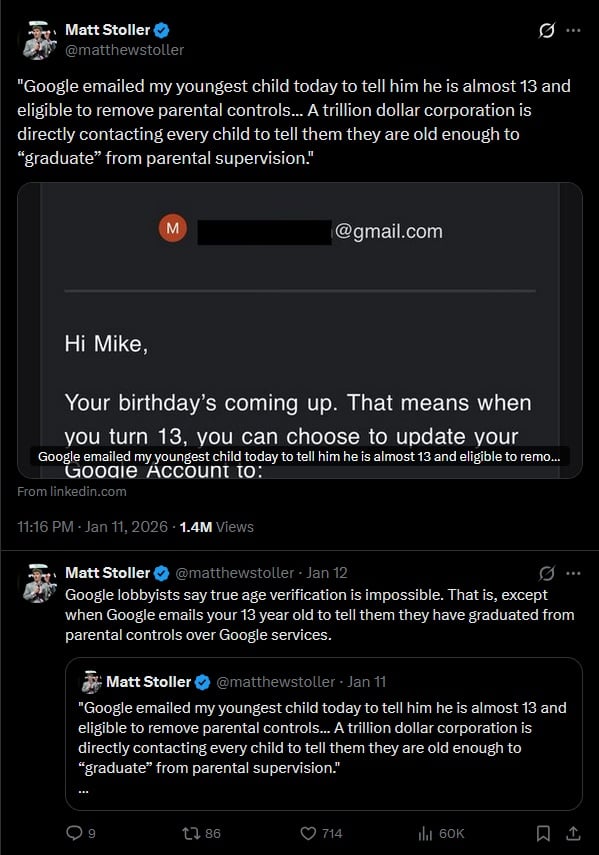Google semble envoyer des emails aux enfants de 12 ans pour leur expliquer qu’à 13 ans, ils pourront enlever le contrôle parental … Mais … :