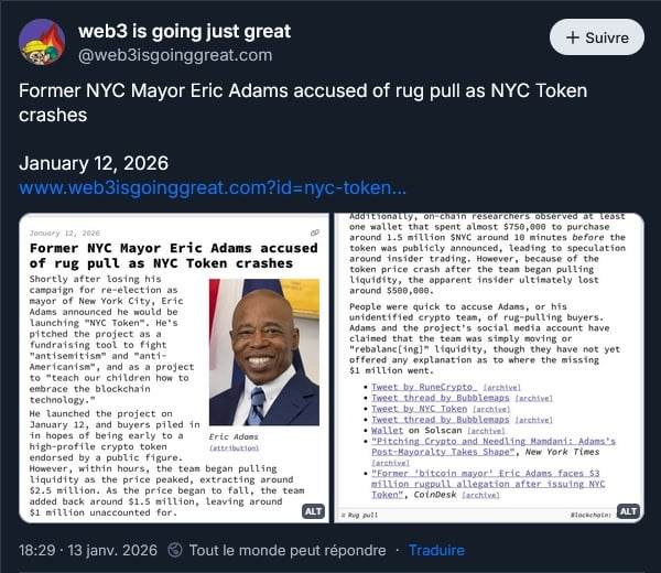 L’ancien maire de New York Eric Adams, celui des détecteurs d’armes IA dans le métro qui ne fonctionnent pas, est accusé d’avoir profité d’une arnaque aux cryptomerdouilles :